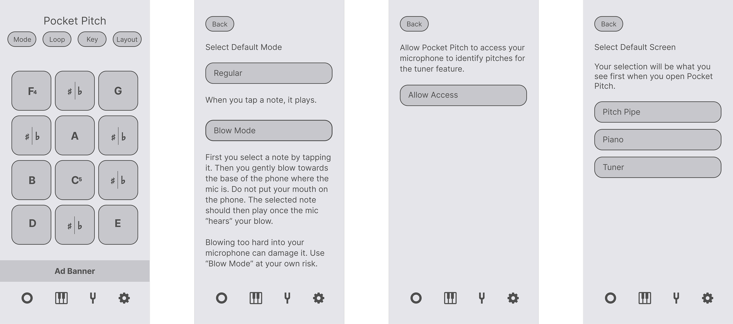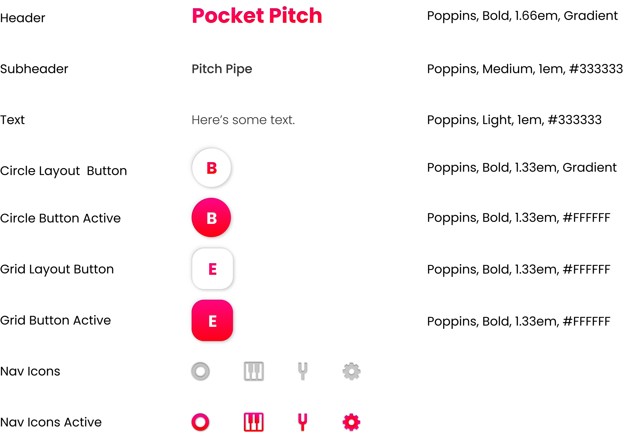 For my MVP I decided to make a digital pitch pipe rather than a piano because it would be simpler functionality for myself to figure out the programming to. I ended up messing it up enough times that I hired my first freelance developer to build out my designs.