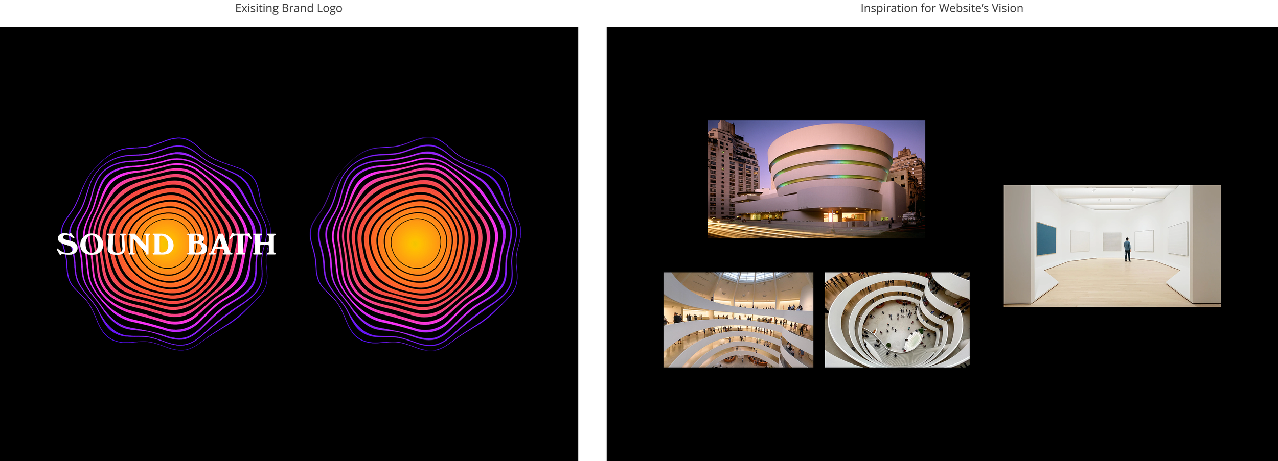 Sound Bath already had visual assets, including a very cool logo. After discussions with the stakeholders, the agreed upon vision was to feel like a modern museum — bolder brand focus upon arrival, and then more visual focus on the offerings being showcased once the user navigates further in.