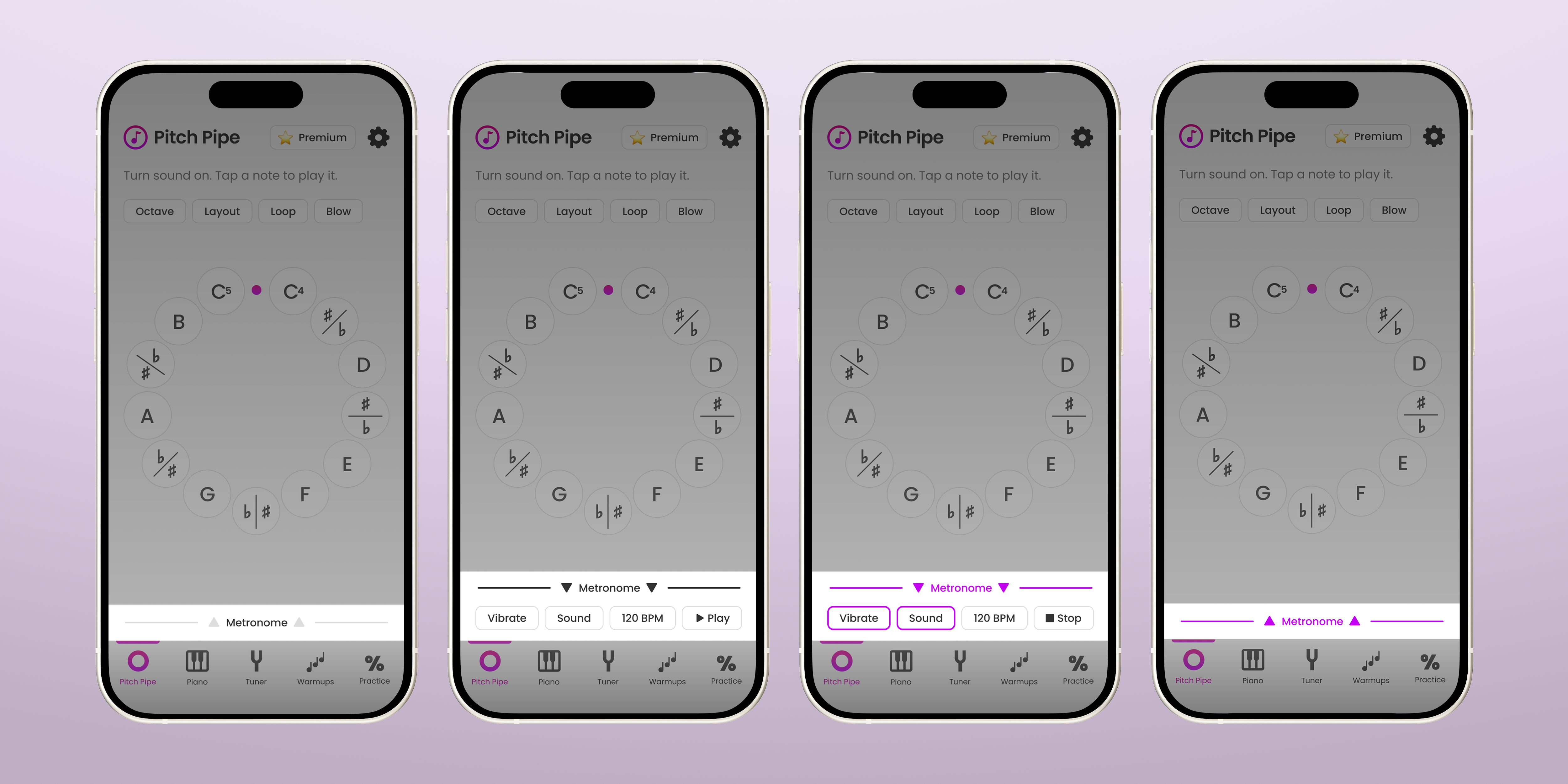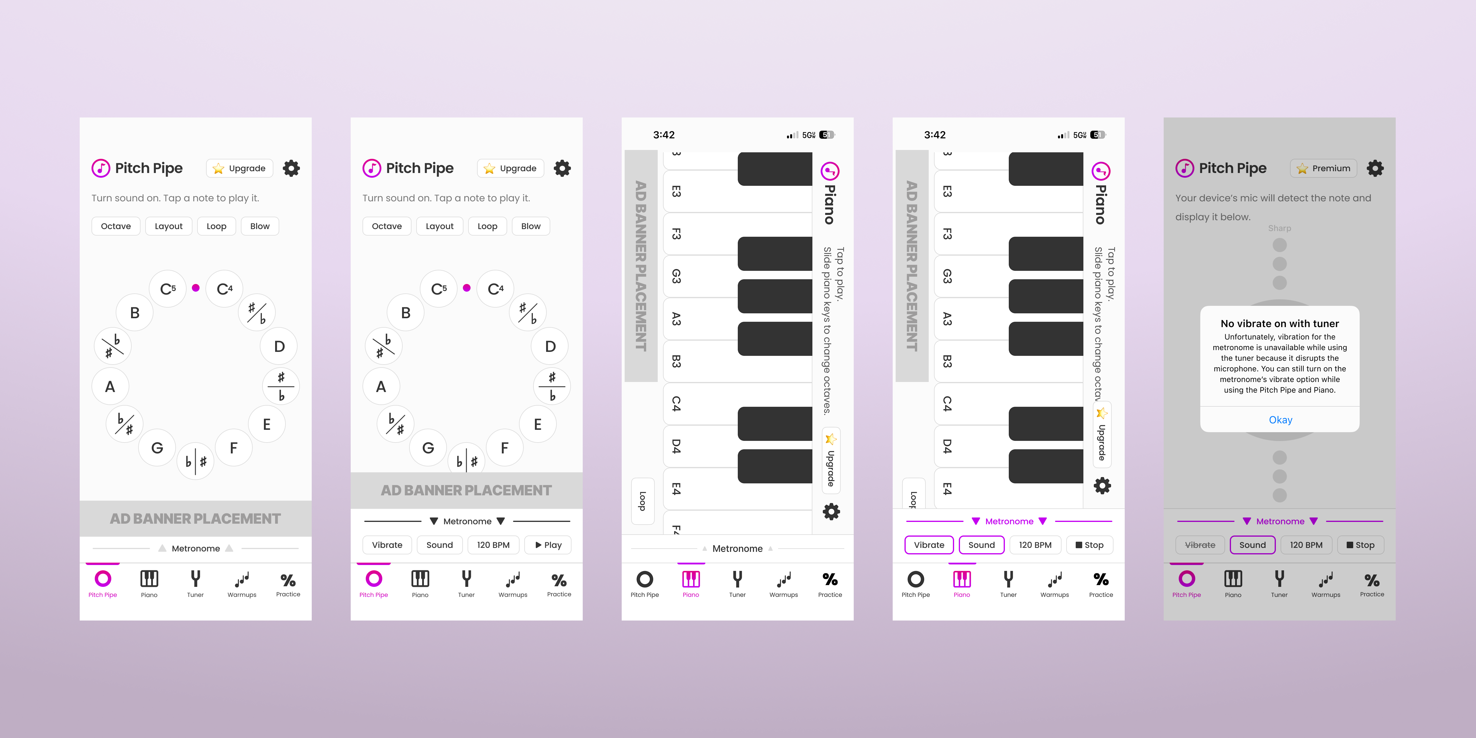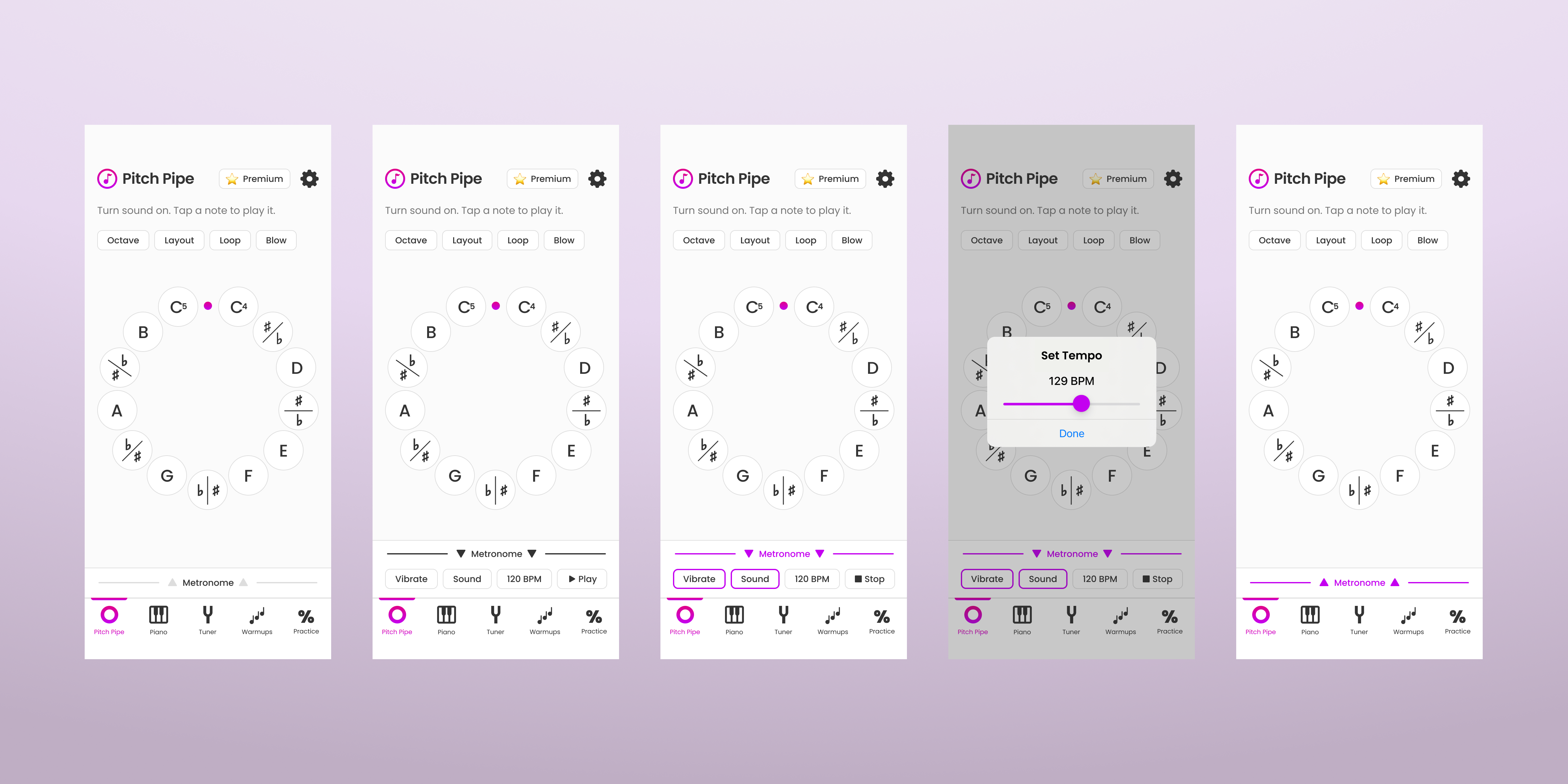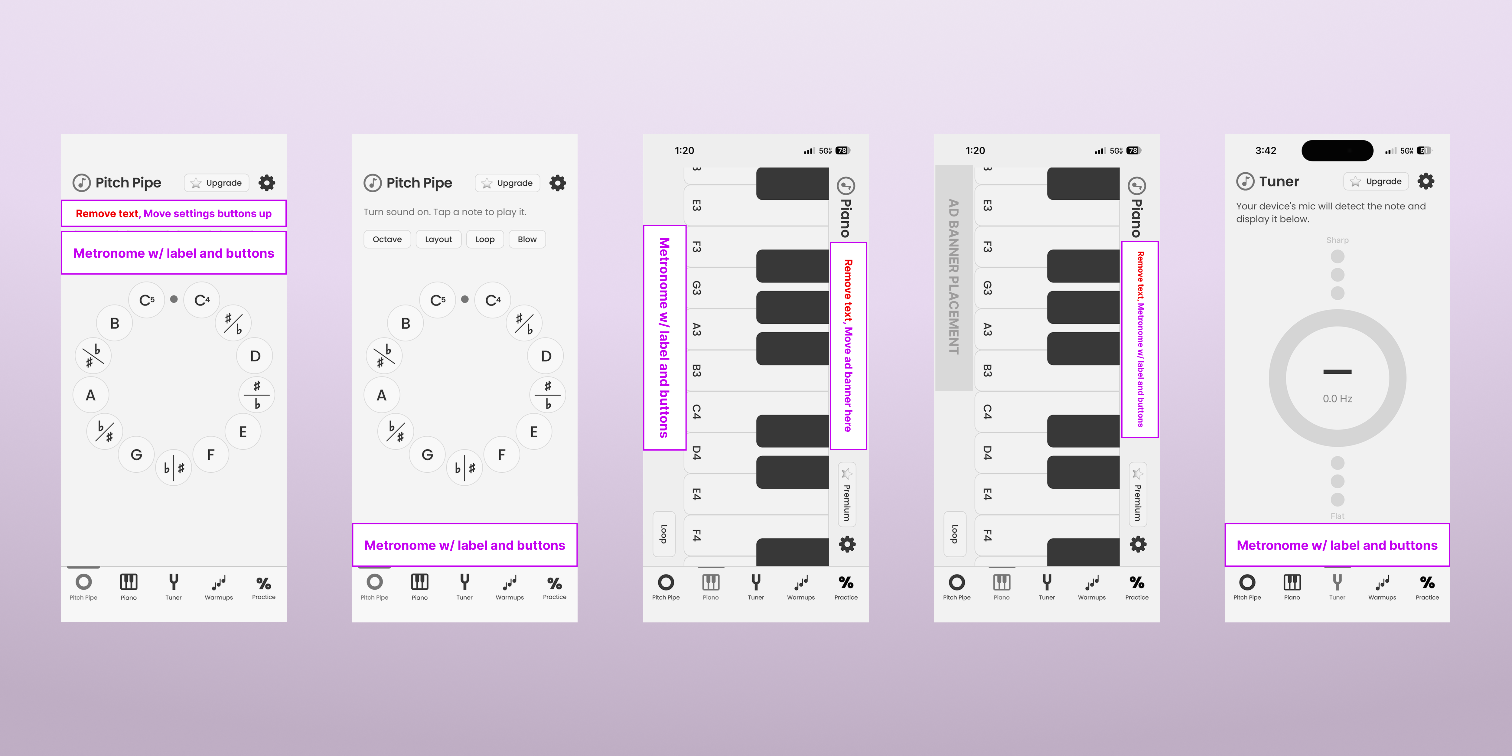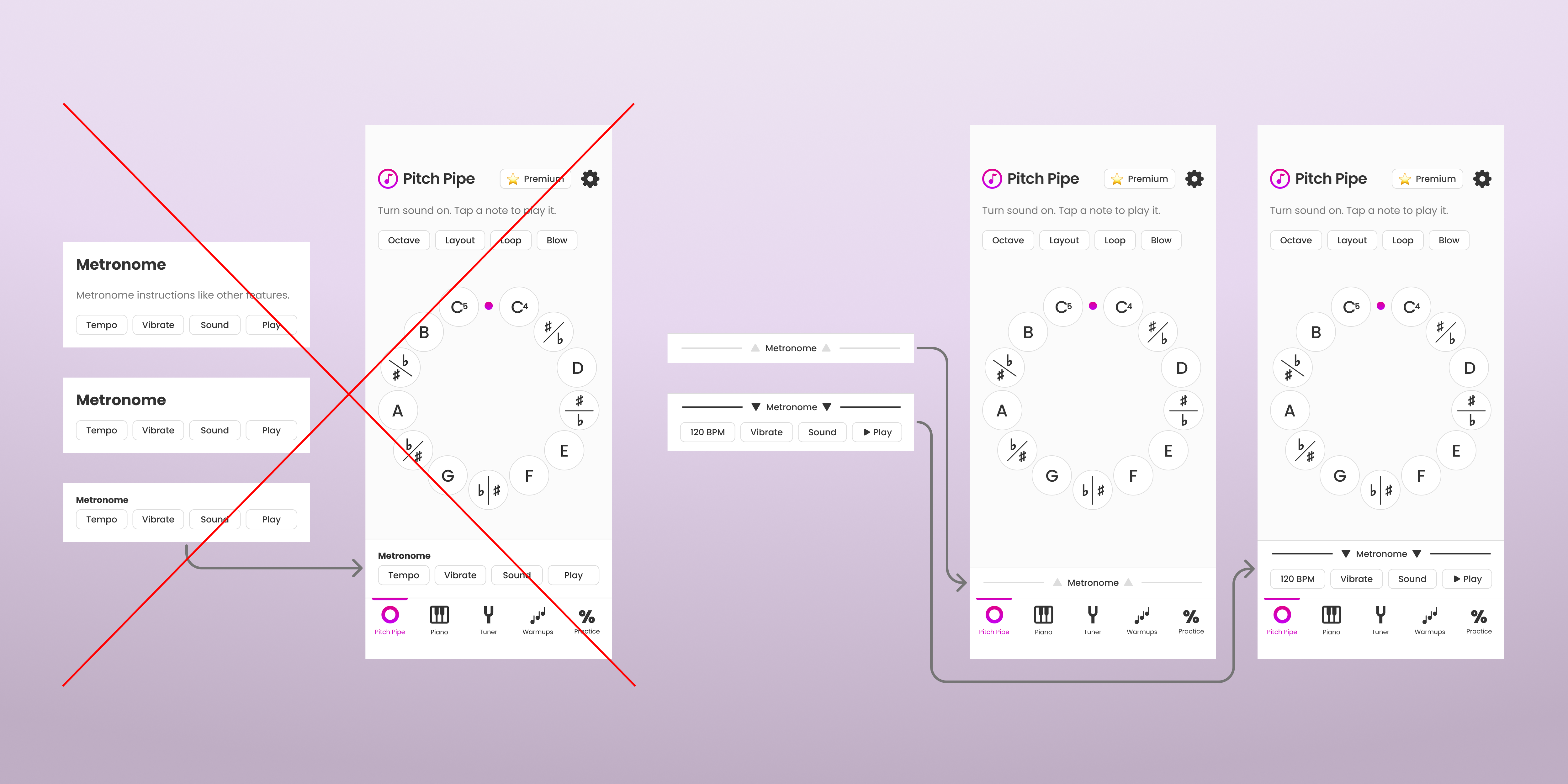 I explored different approaches for integrating the metronome into the existing UI for the Pitch Pipe, Piano, and Tuner. There were some options, but I was bothered that there wasn't a solution that was consistent across all screens. What if a user wanted to run the metronome and actively switch between the pitch pipe and piano or tuner?